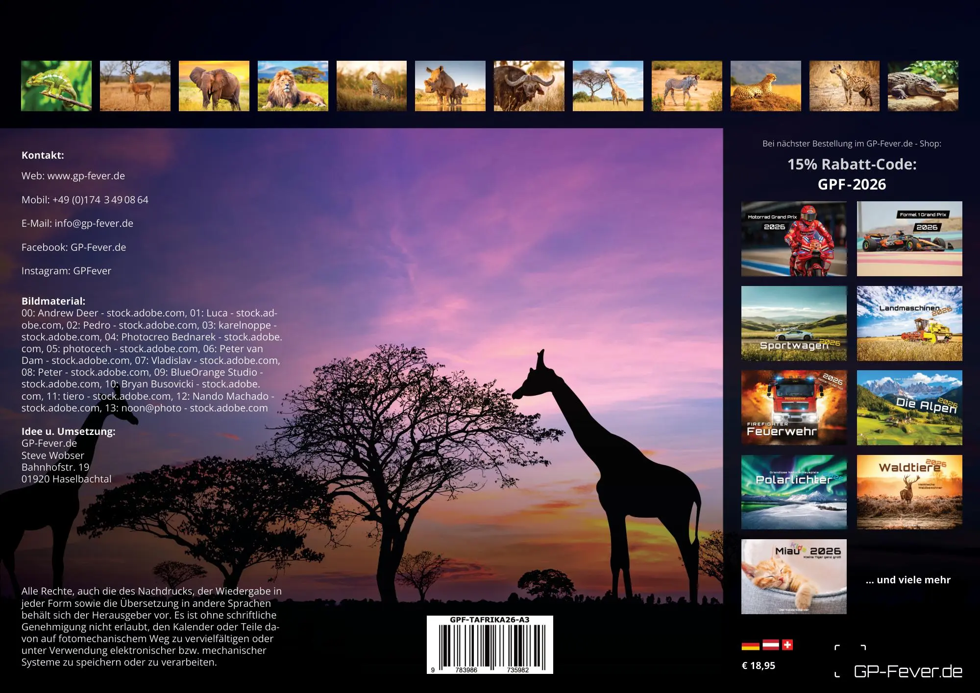Hole dir die afrikanische Tierwelt nach Hause - Unser hochwertiger Kalender bietet euch 14 wundervolle Tieraufnahmen vom Kontinent Afrika! Seid gespannt und sichert euch euer Exemplar im Format DIN A3, DIN A2 (extragroß) für das Jahr 2026!