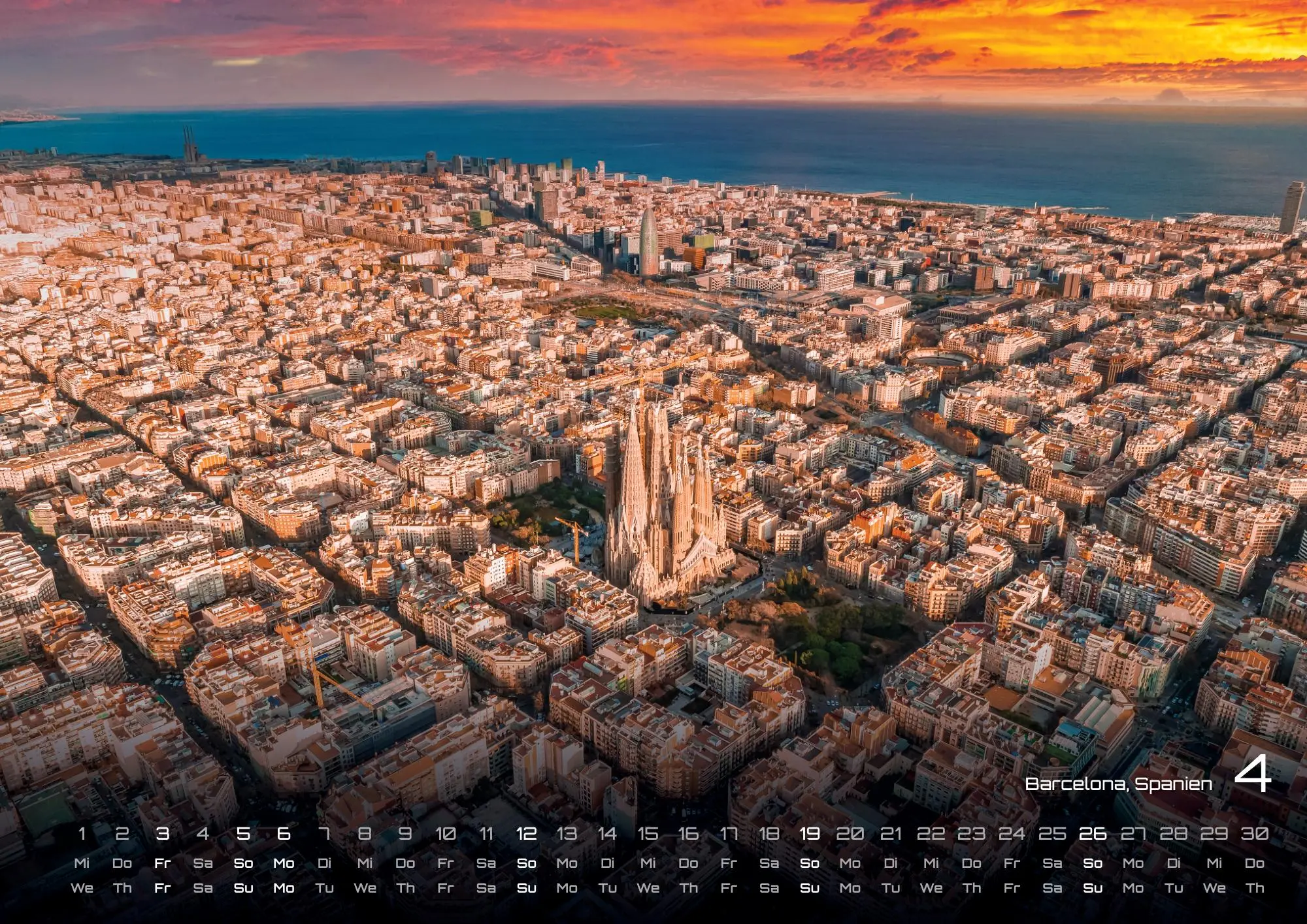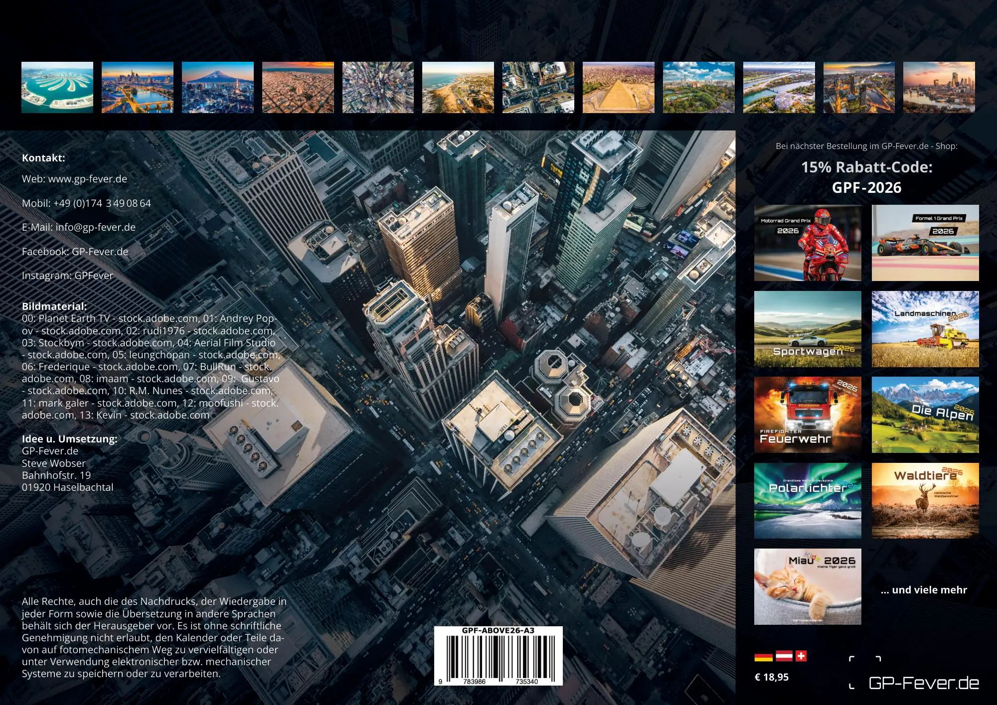 ABOVE - die Welt von oben! Wir haben in diesem Kalender für das Jahr 2026, 14 fesselnde Luftaufnahmen unserer Städte und Landschaften zusammengestellt. Seid gespannt auf brillante Aufnahmen und sichert euch euer Exemplar im Format DIN A3, DIN A2 (extragroß) für das Jahr 2026!