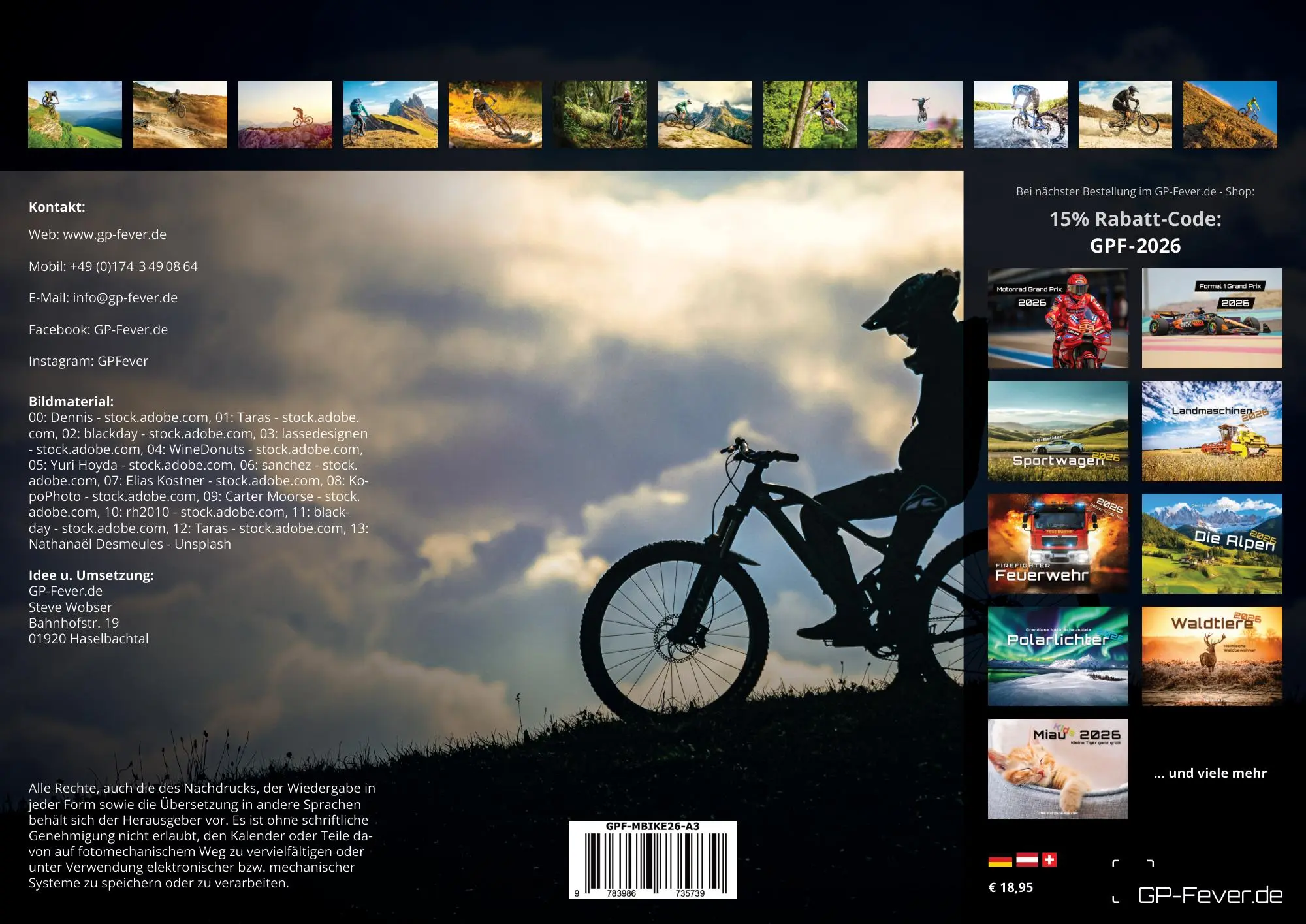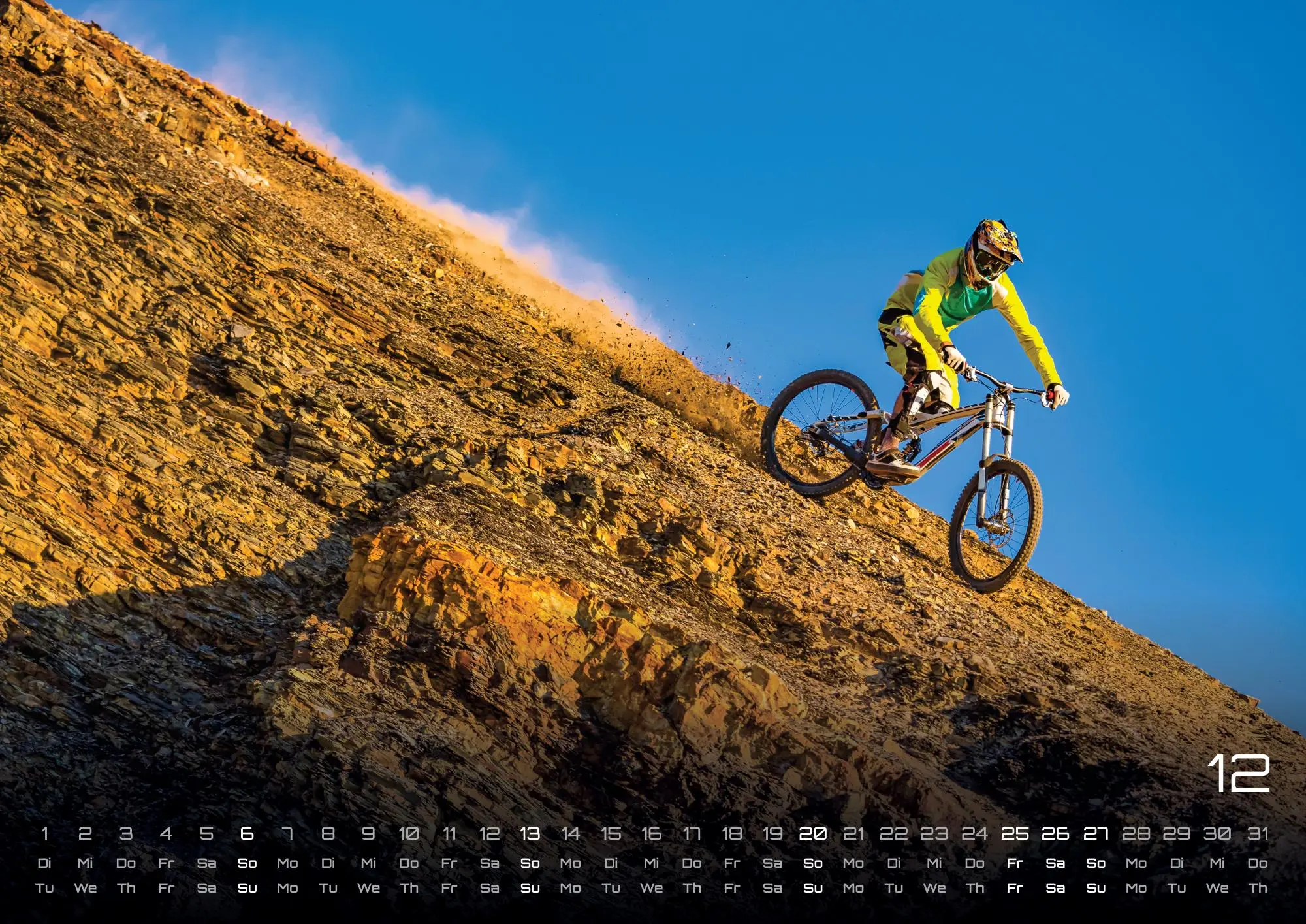 Bike-Freaks aufgepasst! In unserem MTB-Kalender 2026 erwarten euch 14 tolle Mountainbike Aufnahmen für das kommende Jahr. Ein Must Have für jeden Fahrrad-Fan oder als ideale Geschenkidee geeignet. Seid gespannt und sichert euch den Bike-Kalender im Format DIN A3 oder A2 (extragroß) für das Jahr 2026!