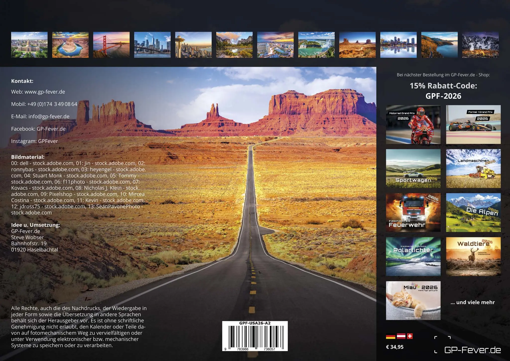 Das Land der unbegrenzten Möglichkeiten. Lasst euch von 14 faszinierende Aufnahmen, von der Golden Gate Bridge bis zum Mount Rushmore, fesseln. Es erwarten euch wundervolle Sehenswürdigkeiten und Landschaften des Kontinents Amerika. Seid gespannt und sichert euch euer Exemplar im Format DIN A3, DIN A2 (extragroß) für das Jahr 2026!